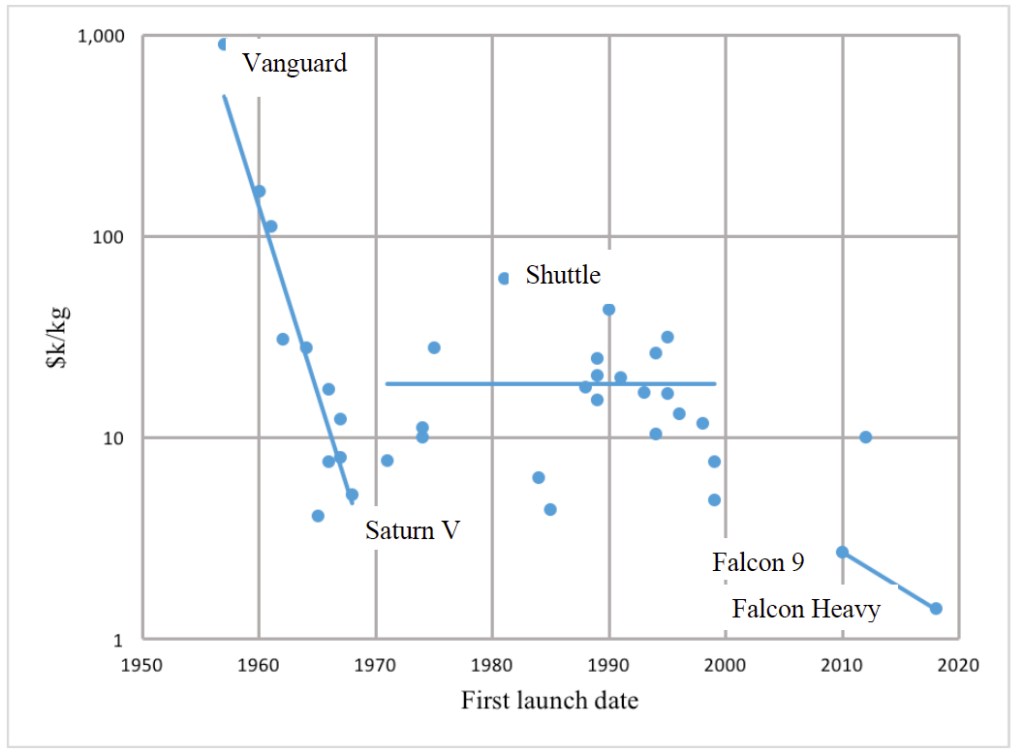 Launching stuff into space doesn’t come cheap, and getting stuff up there is a big technological challenge. Humans have been launching rockets into space since 1957, and the general trend has been to see lower costs over time, with a noticeable hiccup in costs during the Space Shuttle era when the price of re-using the vehicle itself considerably inflated costs. Figure 1 shows the long-term pattern of prices for major rockets, and is divided into approximately four stages of development, characterised as Vanguard (when the first rockets were developed), Saturn V (when non-reusable rocket technology matured), Shuttle (when prices rose for the use of this orbital vehicle) and Falcon, when SpaceX started dropping prices. I took Figure 1 from a paper by Harry Jones, entitled The Recent Large Reduction in Space Launch Cost. I will recreate figure 1 with some changes later in this post.
