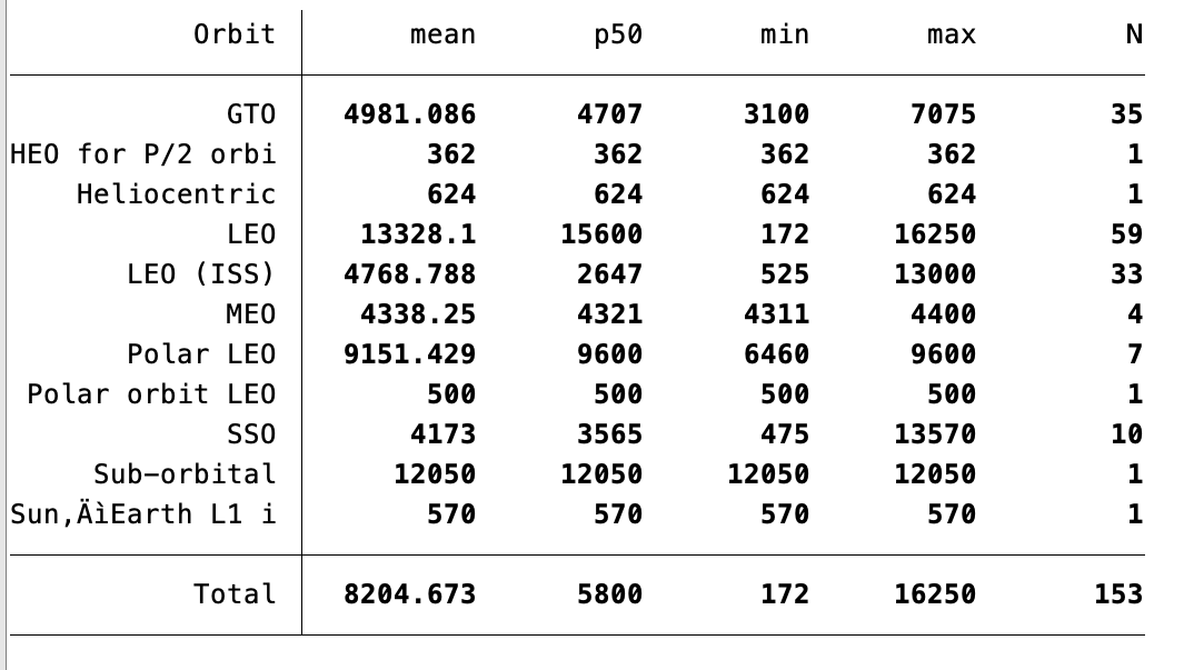 In fact most flights of the Falcon 9 have been far below its maximum payload. Figure 3 shows the mean, median, minimum and maximum payload by orbital destination for the 153 launches on which this data is available. No GTO flight has reached the sticker payload of 8300 kg, and the largest payload for LEO is 16250kg (all these flights were starlink deliveries, when the incentive and opportunity to use the maximum payload was greatest). Note the LEO(ISS) weights – these are deliveries to the International Space Station. Under the contract linked above, these flights are being paid for at somewhere between 100 and 400 million dollars per flight, giving a ludicrously high cost of – on average – between $20,000 and $85,000 per kg. This is potentially more expensive than the space shuttle, depending on the content and nature of the contract.
