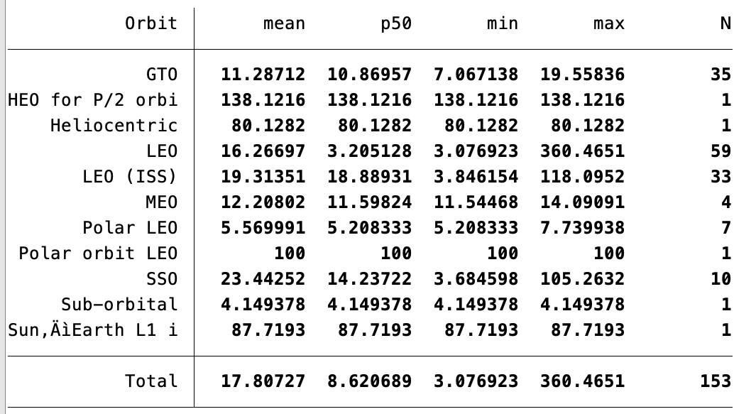 Once I downloaded this data and did some unpleasant work importing it to Stata I produced some basic summaries of the data, such as mean payload weights, maximum weights, proportion of flights that were government contracts, etc. I also calculated a price/kg for each flight based on the sticker price of 62 million for a new rocket or 50 million for a recycled one, and also attempted to identify rockets that were new on launch and were not recycled (these would be “expendable” rockets).