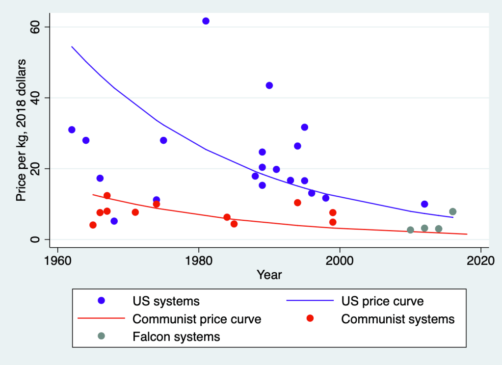 Figure 5 shows the price/kg of rocket launches from 1962 to 2018, with launches coloured blue for non-communist and red for communist states. Corresponding lines of best fit from the regression model are shown in the same colour, and some indicative Falcon 9 launch prices are plotted at the end in green. For indicative Falcon 9 prices I chose a) the median LEO price of $3210/kg; b) the optimum true LEO price of $3030/kg; c) a likely ISS supply price of $7,880/kg based on a $134 million contract; and d) the dishonest website price everyone quotes of $2,700/kg. We could also include $6000/kg, which is cited on the website for rideshares, but I forgot to, and can’t be bothered making this figure again.
