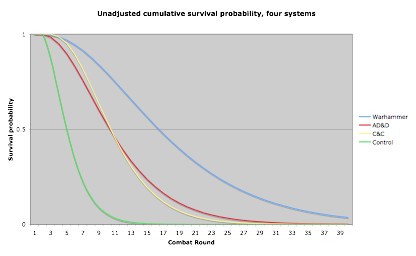 It actually takes a long time to die in Warhammer, with a concomitant number of die rolls. At the unadjusted median survival time, if the player wins, he or she will have rolled 17 attack rolls and 3 damage rolls (on average); he or she will also have suffered an average of 6 attacks that required defensive rolls, giving a total number of defensive rolls of between 6 and 12, for a total of 26 – 32 rolls. The D&D player will have rolled 11 attacks and 3 damage rolls, for a total of 14 rolls. The C&C player will have rolled just the 11 attack rolls, and the control player will have rolled 5 attacks and 3 damage rolls for a total of 8 rolls.