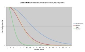 I came to this comparison because on Friday and Sunday last week I role-played respectively in Pathfinder and Warhammer 2nd edition, and I was struck in both instances by the length and inevitable dreariness of the combat, and by the fact that both combats had to be ended by a non-combat act of the GM’s. This post, about the probability of survival in each of three systems, will serve to show how this comes about and also I think reveals some obvious conclusions about tactical combat rules in role-playing. I aim to expand on this post in future with a proper simulation and statistical analysis, complete with survival curves, but that will take a bit of time.