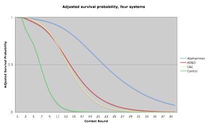 The probability of surviving a single round, and the cumulative probability of surviving multiple rounds, are calculated here based on the underlying combat mechanic of three systems – Warhammer 2nd edition, D&D 3.5, and my own Compromise and Conceit modifications of the d20 system. All three are compared with a putative “control” system in which the mechanics are not specified, but are assumed to result in a 50% probability of a hit in any given round, and death after 3 successful hits. The chief conclusion for each system is the number of rounds required to fight before reaching a 50% chance of death, referred to hereafter as the “median survival time,” though strictly speaking this is not a median survival time. In practice of course time to death varies according to the good or bad luck of the player, and how much they lie about their rolls to the GM, so survival time should here be assumed to be roughly representative of a long-run probability. The methods presented here also use various simplifications and approximations, specifically ignoring the role of criticals, fate points, and the death spiral in the Compromise and Conceit system, which makes the order of hits important for survivability.